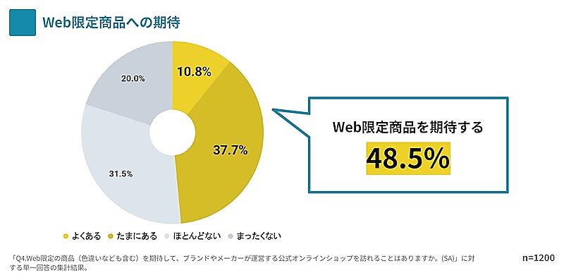 ブランドやメーカーが運営する公式オンラインショップを訪れる際、Web限定商品を期待することがあるか聞くと、「よくある」が10.8%、「たまにある」が37.7%で、合計48.5%が一定の期待を持っていることがわかった。一方で、「ほとんどない」(31.5%)、「まったくない」(20.0%)と、期待していない層は全体の51.5%だった。