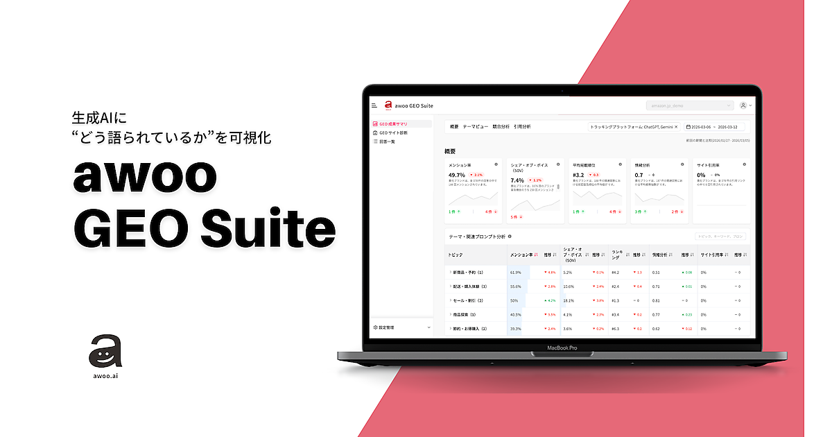 AIを活用したマーケティング支援サービスを展開するawooは3月18日、生成AI上における自社ブランドの見え方や評価を可視化する新サービス「awoo GEO Suite」を発表した。