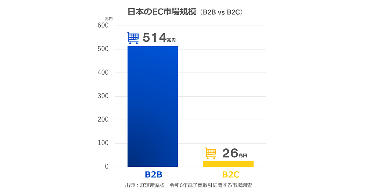 経済産業省の「電子商取引に関する市場調査」によると、2024年の国内BtoB-EC市場規模は514兆4069億円。BtoC-EC市場の26兆1225億円と比べると約20倍に相当する。