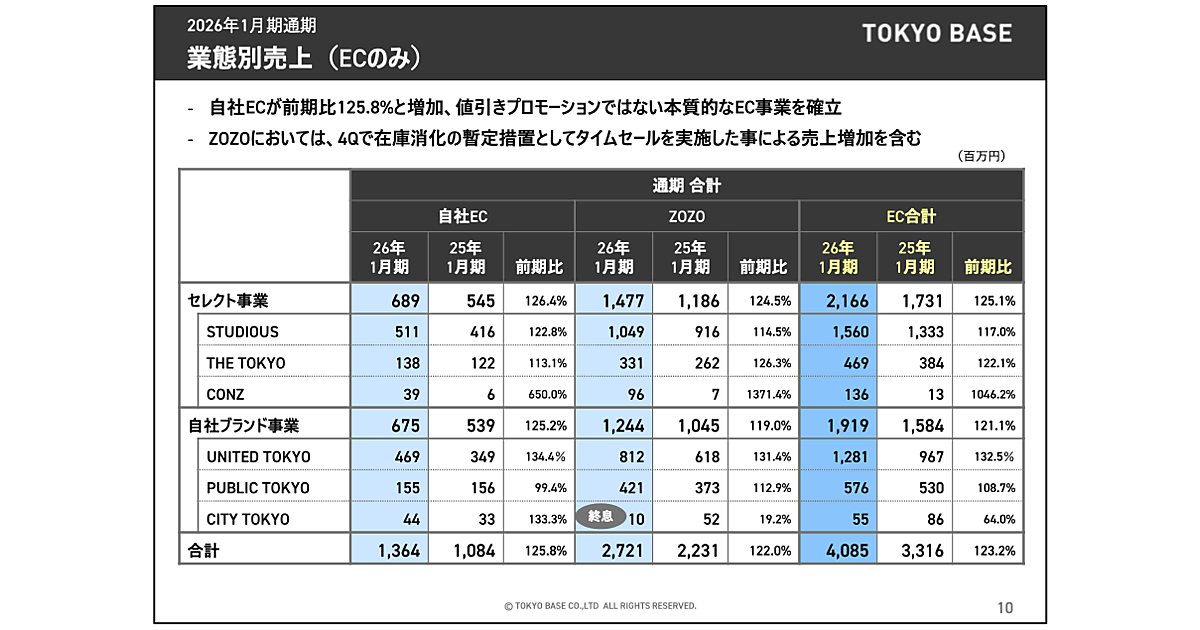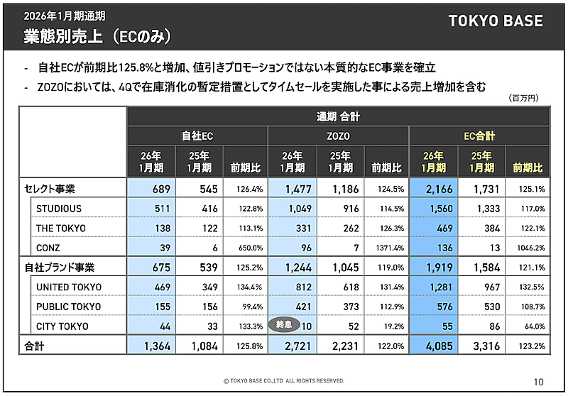 EC売上の内訳は、自社ECが前期比25.8%増の13億6400万円、ZOZOが同22.0%増の27億2100万円。自社ECではクーポンや割引施策を廃止し、値引きに依存しない販売体制へ転換。TOKYO BASEは「本質的なEC事業の確立が進んだ」と評価し、谷正人社長は「裸の状態から力を作り直し、本質的なECを確立できた」とコメントしている。一方、ZOZOでの販売は第4四半期に在庫消化のためのタイムセールを実施したことが売上増に寄与した。