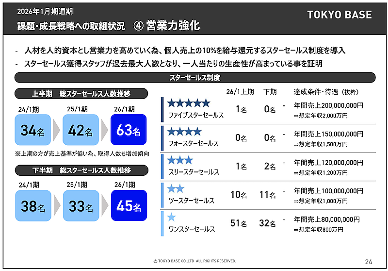 人材施策では、営業力強化に向けた人事制度の拡充を推進。2017年から導入している個人売上の10%を給与に還元する「スターセールス制度」が成果を上げている。年間個人売上8000万円を超える社員数が過去最多を更新。上半期は63人(前年同期42人)、下半期は45人(同33人)が達成した。