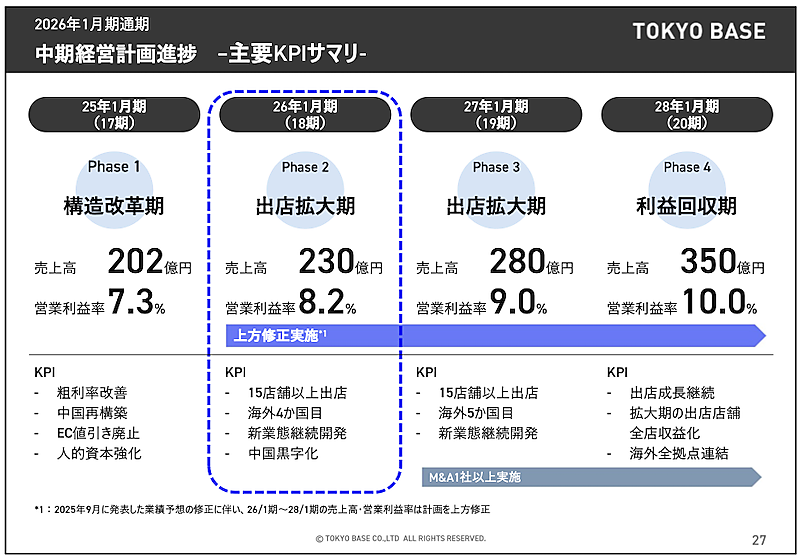KPIとして、2027年1月期は「15店舗以上の新規出店」「5カ国目の海外展開」「新業態の継続開発」を掲げる。2028年1月期は「出店成長の継続」「拡大期に出店した店舗の収益化」「海外全拠点の連結」を目標とする。加えて、2期を通じてM&Aを1社以上実施する方針としている。