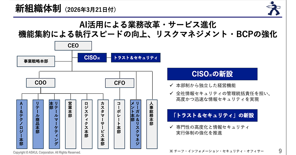 アスクルは3月21日付で、新たな本部体制を導入した。サービス力や収益力、執行スピードの向上に加え、AI活用によるバリューチェーンの再構築、サイバーセキュリティを含むリスクマネジメント機能の強化を目的に、組織体制を見直した。全社の情報セキュリティを統括するCISO(チーフ・インフォメーション・セキュリティ・オフィサー)も新設した。