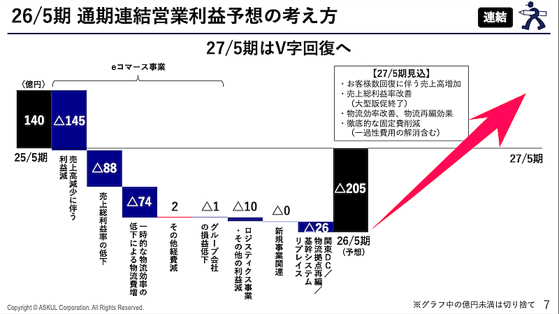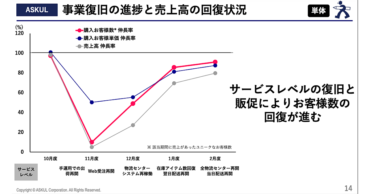 主力のASKUL事業は、サービスレベルの復旧と販促施策により顧客数の回復が進んでいる。2025年11月のWeb受注再開以降、顧客数・顧客単価・売上高はいずれも回復軌道に乗った。2026年2月には全物流センターの再開と当日配送の復旧が完了し、さらに回復が進んでいるという。