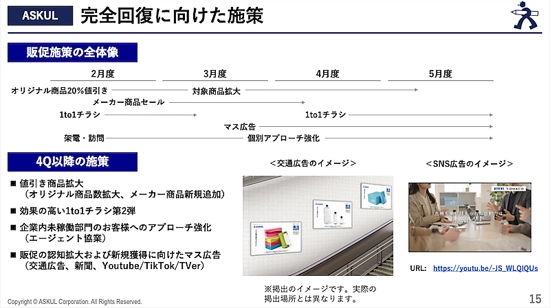 「完全回復」に向けて、値引き対象の拡大(オリジナル商品数の拡充、メーカー商品の追加)、効果の高い「1to1チラシ」の展開、企業内の未稼働部門へのアプローチ強化(エージェント協業)などを実施。交通広告や新聞、YouTube、TikTok、TVerなどを活用したマス広告も展開し、認知拡大と新規顧客の獲得を進めている。