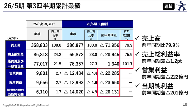 2025年6月-2026年2月期(第3四半期)の連結売上高は前年同期比20.1%減の2868億7700万円。営業損益は124億8400万円の赤字(前年同期は98億100万円の黒字)、経常損益は139億9300万円の赤字(同96億5600万円の黒字)、当期純損益は140億2000万円の赤字(同61億1000万円の黒字)となった。