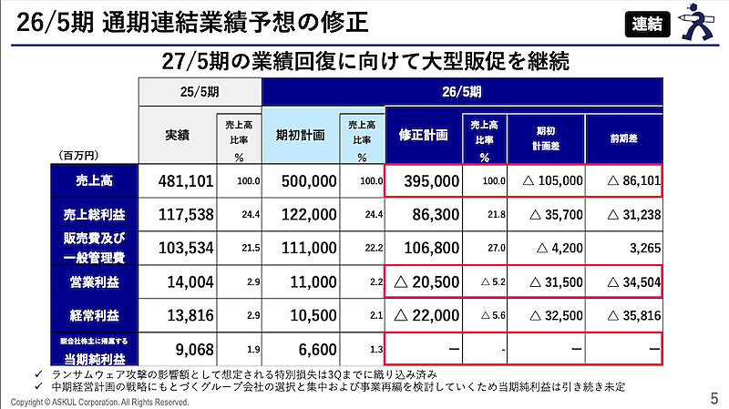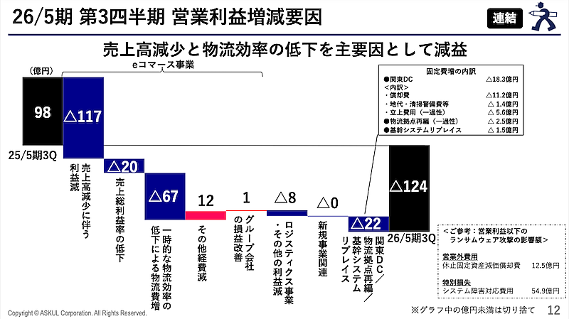 減益の主因についてアスクルは、ランサムウェア攻撃による売上高の減少と物流効率の低下をあげている。なお関連費用として、営業外費用に休止固定資産減価償却費12.5億円、特別損失にシステム障害対応費用54.9億円を計上している。