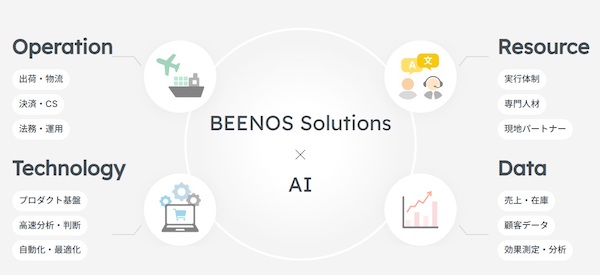 - サービス内容:BEENOSグループが提供する自社サイトの越境EC化サービス「Buyee Connect」や、「Buyee.jp」「Shopee」などの外部モールへの代理出店を支援する。支援では、物流、決済、カスタマーサポート、販売データの集約・分析機能を提供。利用企業は自社開発をせずに越境販売体制を構築できる。