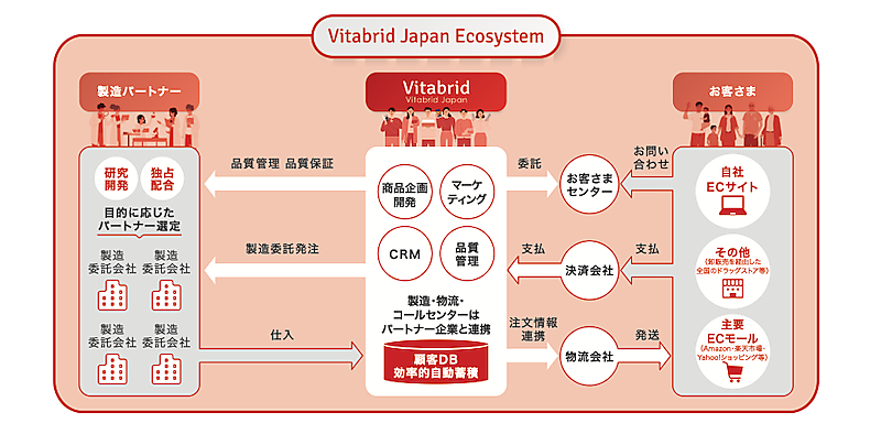 ビタブリッドジャパンは自社ECを中心に、独自の基幹システムや自動化の仕組みを整備し、受注、配送、代金回収、顧客対応、在庫管理を一元管理している。