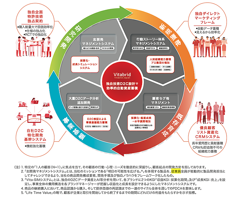 特許や独占製造契約による模倣されにくい独自商品に加え、データを蓄積・活用する「スマート蓄積型D2Cエンジン」で持続的な成長をめざしている。「スマート蓄積型D2Cエンジン」は、独自の商品開発、新規顧客獲得、CRMによる既存顧客育成、自社基幹システムを軸にした事業基盤を一体で運用する仕組み。商品企画から広告運用、顧客データの蓄積・活用、物流やコールセンターとのシステム連携までを循環させることで、LTV最大化と持続的な事業成長をめざしている。さらに、著名人との長期契約を通じて商品ブランドへの信頼醸成にもつなげている。