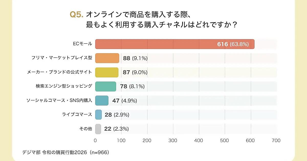 最もよく利用する購入チャネルを聞いたところ、最多は「ECモール」で63.8%、続いて「フリマ・マーケットプレイス型」が9.1%。「メーカー・ブランドの公式サイト」は9.0%だった。