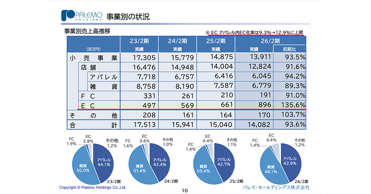 婦人衣料や生活雑貨の専門店を展開するパレモ・ホールディングスの2026年2月期におけるEC売上高は、前期比35.6%増の8億9600万円だった。アパレルにおけるEC化率は前期比3.6ポイント増の12.9%に上昇した。