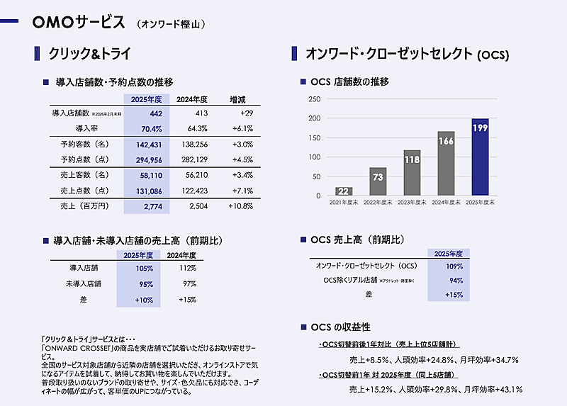 公式ECサイト「ONWARD CROSSET(オンワードクローゼット)」の商品を、実店舗で取り寄せて試着するOMOサービス「クリック&トライ」の導入店舗数は、2025年2月期末から29店増の442店舗。導入率は同6.1ポイント増加の70.4%となった。予約点数は同4.5%増の29万4956点と好調に推移した。また「クリック&トライ」導入店舗の売上高は未導入店舗と比べ前期比で10%上回った。