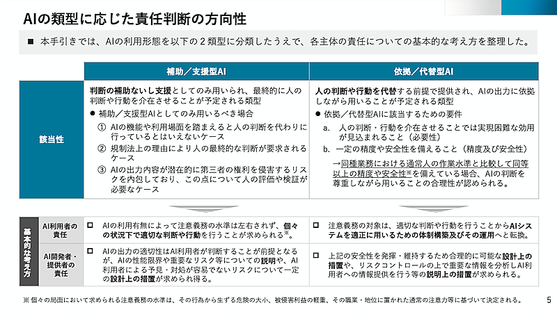 これに対し「依拠/代替型AI」は、人の判断や行動を代替する前提で利用されるもの。この場合、利用者の注意義務は、AIシステムを適切に運用するための体制整備や管理に重点が置かれる。開発者・提供者には、安全性確保のための設計や、リスク管理に必要な情報提供などが求められる。