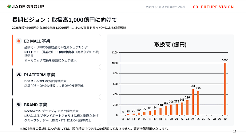 靴やアパレルのECサイト「LOCONDO.jp」やファッションモール「MAGASEEK」「d fashion」を運営するジェイドグループは、2031年2月期に取扱高1000億円、営業利益100億円を目標とする中期計画を進めている。2026年2月期の取扱高は459億3400万円で、5年間での倍増をめざす。