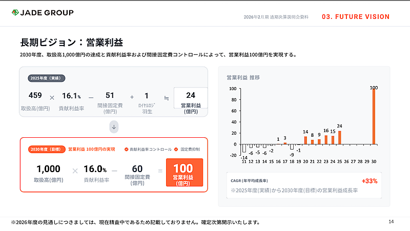 ジェイドグループの2026年2月期連結業績は、商品取扱高が前期比8.9%減の459億3400万円、売上高が同1.1%増の194億4100万円、営業利益が同56.6%増の24億300万円、経常利益が同65.2%増の25億6100万円、当期純利益が同178.0%増の15億7000万円だった。