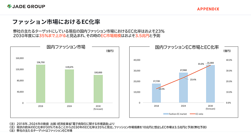 ジェイドグループが成長を見込む背景には、ファッション市場の拡大もある。経済産業省によると、国内ファッション市場のEC化率は現在約23%。ジェイドグループは、欧米のEC化率が約30%であることなどを踏まえ、2030年度には35%まで上昇すると推定している。これにより、ファッションEC市場規模は約3.5兆円まで拡大すると予測する。