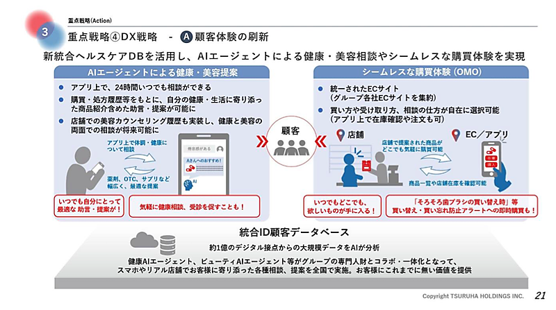 統合ヘルスケアデータベースの活用も柱に据える。約1億件規模のデジタル接点から得られるデータをAIで分析し、健康や美容に関する提案を高度化する構想を掲げる。