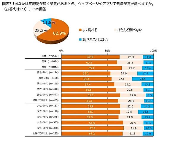 宅配便が届く予定があるとき、ウェブページやアプリで到着予定を調べるかを聞いたところ、最も多かったのは「よく調べる」で62.9%、続いて「ほとんど調べない」が25.3%、「調べたことはない」が11.8%だった。