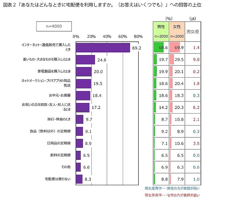 男女別に見ると、「重いもの・大きなものを購入したとき」は女性29.5%、男性19.7%で女性のほうが9.8ポイント高い。また、「お祝いの品を親族・友人・知人に送るとき」は女性20.3%、男性14.2%となっており、こちらも女性が男性を上回っている。「日用品の定期便」も女性10.6%、男性7.1%と女性のほうが3.5ポイント高かった。