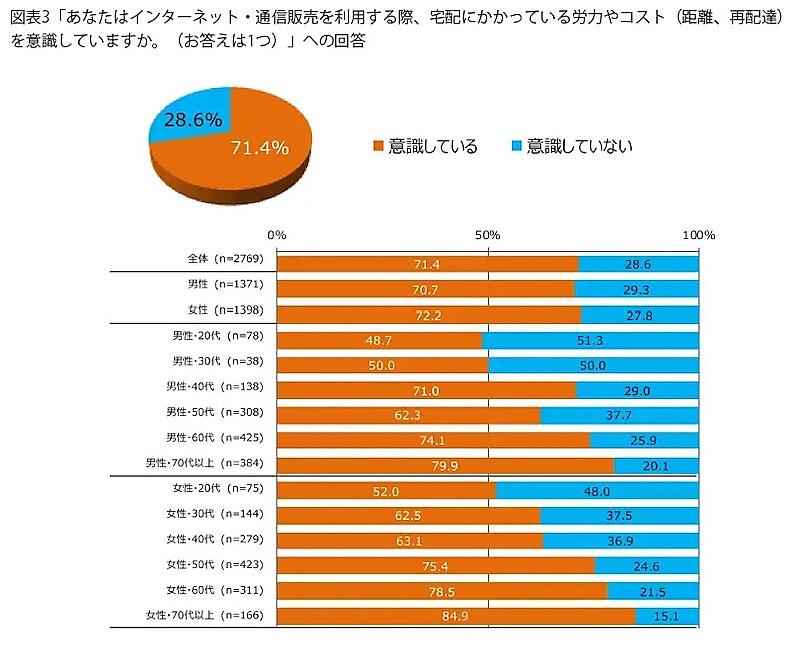ネット通販を利用する際に、宅配にかかる労力やコスト(距離・再配達)を意識しているかどうかは、「意識している」が71.4%だった。プラネットによると2017年の同調査では64.3%、2022年の同調査では68.0%だったといい、年を追うごとに上昇している。