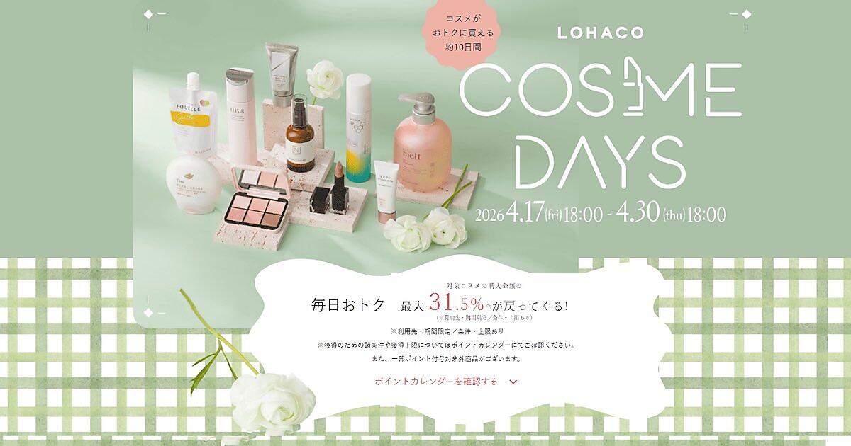 アスクルは4月17日、BtoC向けECサイト「LOHACO」で、期間限定の化粧品ECセールイベント「LOHACO COSME DAYS(ロハコ コスメデイズ)」を開始した。期間は4月30日18時まで。ポイント付与などにより、最大で31.5%を還元する。