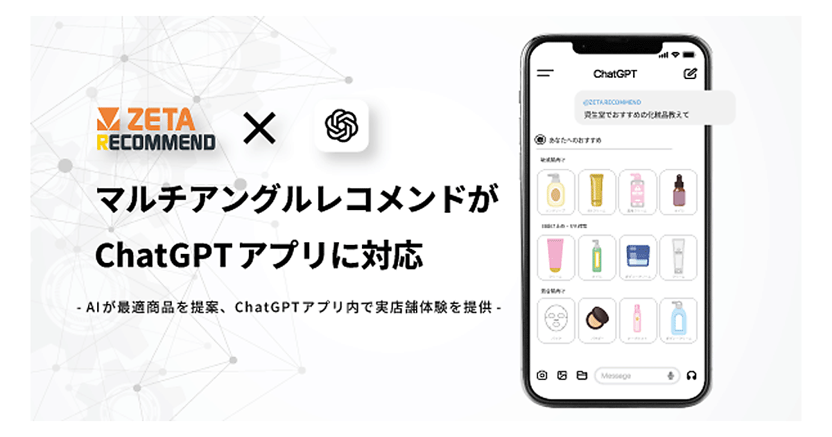 ZETAは、AIレコメンドエンジン「ZETA RECOMMEND」の「マルチアングルレコメンド」が「ChatGPT」アプリに対応したと発表した。