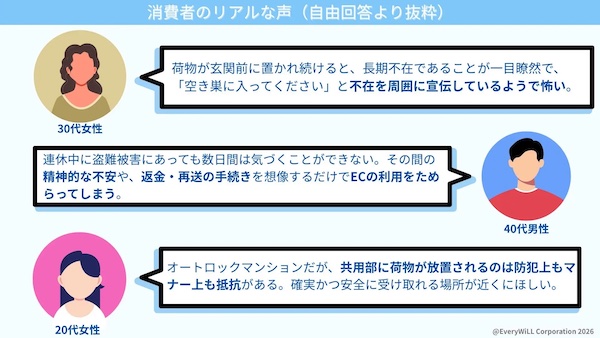 回答者からは「連休中に盗難被害にあっても数日間は気づくことができない。その間の精神的な不安や、返金・再送の手続きを想像するだけでECの利用をためらってしまう」「荷物が玄関前に置かれ続けると、長期不在であることが一目瞭然で、『空き巣に入ってください』と不在を周囲に宣伝しているようで怖い」「オートロックマンションだが、共用部に荷物が放置されるのは防犯上もマナー上も抵抗がある」といった声があがった。