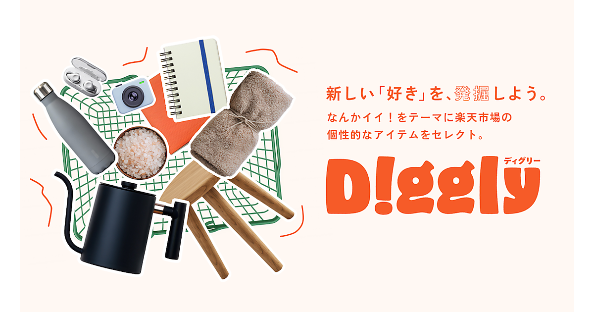 「Diggly」は「掘り出す・発掘する」を意味する「Dig」に由来する名称。「なんかイイ!がココに。」をコンセプトに、「楽天市場」の5億点以上の商品から選定したアイテムを紹介する。
