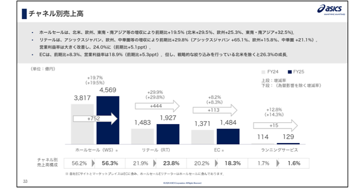 アシックスの2025年12月期におけるEC売上高は、前期比8.3%増の1484億円だった。北米市場での戦略的な絞り込みの影響を除くと伸び率は26.3%になったという。ECの営業利益率は同5.3ポイント増の18.9%、EC化率は同1.9ポイント減の18.3%となった。