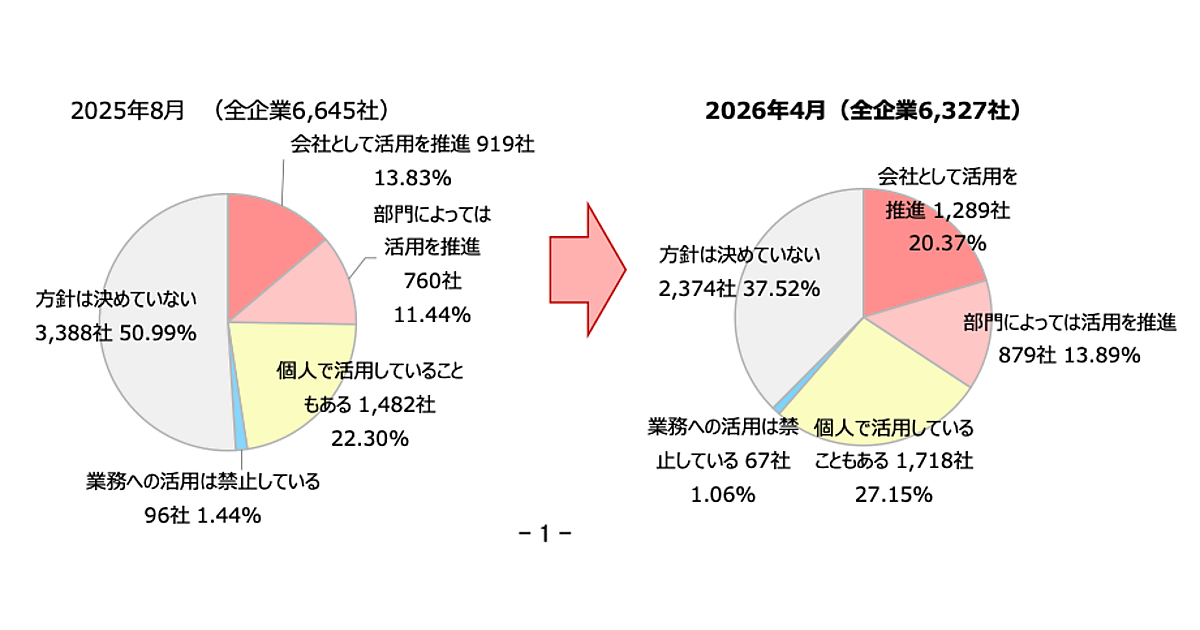 一方、「方針は決めていない」とする企業は37.5%で、前回調査(2025年8月)の50.9%から13.4ポイント低下した。企業の姿勢は様子見から、全社・部門導入や個人利用を含めた活用へとシフトしている。