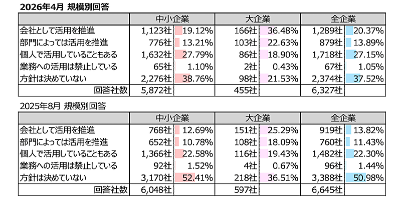 一方、中小企業は「方針未定」が38.7%で最多。「会社として推進」は19.1%、「部門推進」は13.2%で、組織的活用は32.3%にとどまる。ただし前回比では8.9ポイント上昇しており、導入は進みつつある。