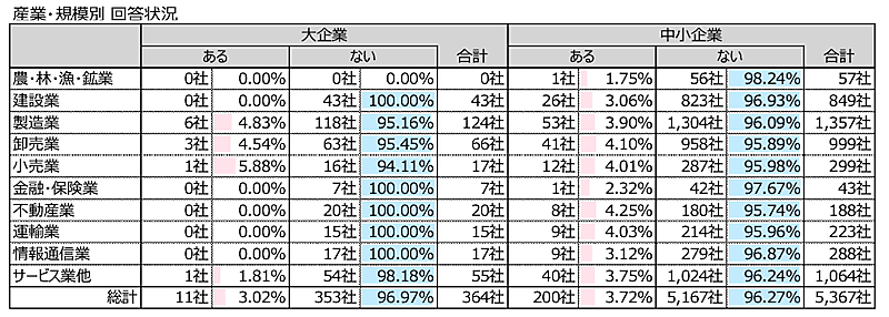 規模別では、「ある」は中小企業が3.7%、大企業が3.0%だった。産業別・規模別で見ると、5%を超えたのは分母の少ない大企業の小売業のみで、広範な人員削減の動きが進んでいるとは言いにくそうだ。