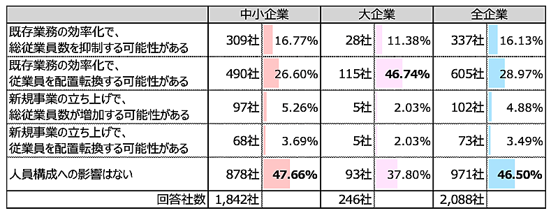 特に大企業では、「配置転換の可能性」が46.7%と高く、中小企業(26.6%)を大きく上回った。生成AI活用を前提とした人材配置の見直しが進みつつある。