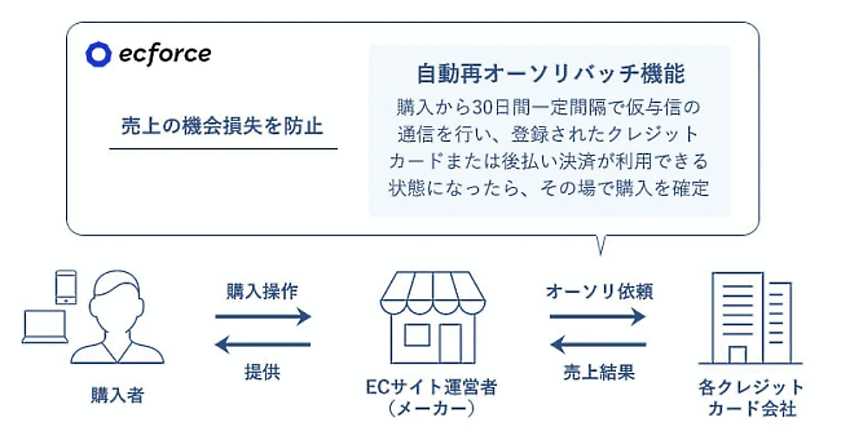 「自動再オーソリバッチ機能」はこの機会損失の抑制を目的に開発した機能。商品購入から30日間、一定間隔で仮与信の通信を行い、登録されたクレジットカードまたは後払い決済が利用できる状態になると、その場で購入を確定できる。