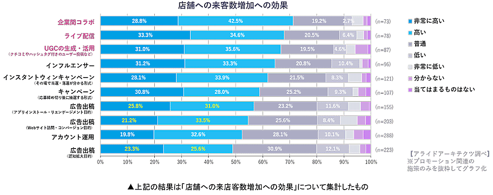 「予算をかけている施策別の費用対効果の実感」について分析したところ、企業間コラボやライブ配信、UGC生成・活用に取り組んでいる企業が、Twitterマーケティングの費用対効果の高さを実感する傾向にある。店舗への来客数増加への効果を例にとると、これらの施策に取り組む企業は66%以上が費用対効果の実感を「非常に高い」「高い」と回答している。