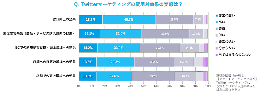 従来のTwitterマーケティングは、認知獲得施策に重きを置く企業が多かったが、今回調査ではEC売上や店舗送客などの目的でも費用対効果を実感している企業が多いことがわかった。