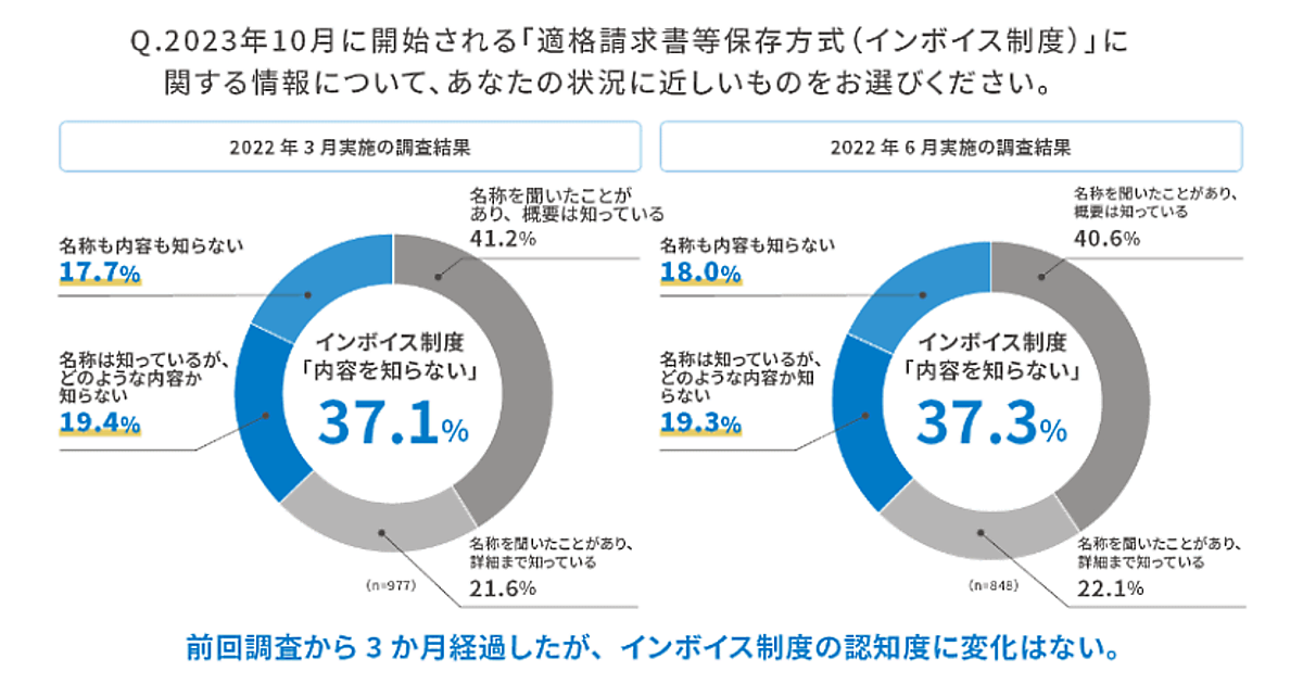 インボイス制度は約4割の企業が「知らない」と回答、改正電子帳簿保存法は施行から6か月が経過したが約2割しか対応できていなかった。