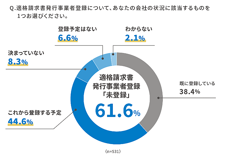 適格請求書発行事業者登録について「すでに登録している」と回答しているのは38.4%で、残り61.6%の企業は未登録。2023年10月のインボイス制度開始から登録を受けるためには、2023年3月末までに適格請求書発行事業者登録申請を行う必要があるため、早期に対応を行う必要がある。