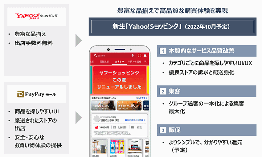 コマース事業においては10月、「Yahoo!ショッピング」と「PayPayモール」を統合して、新生「Yahoo!ショッピング」へリニューアル。分かりやすいユーザー体験、優良店の訴求、送客の一本化により取扱高の最大化をめざす。