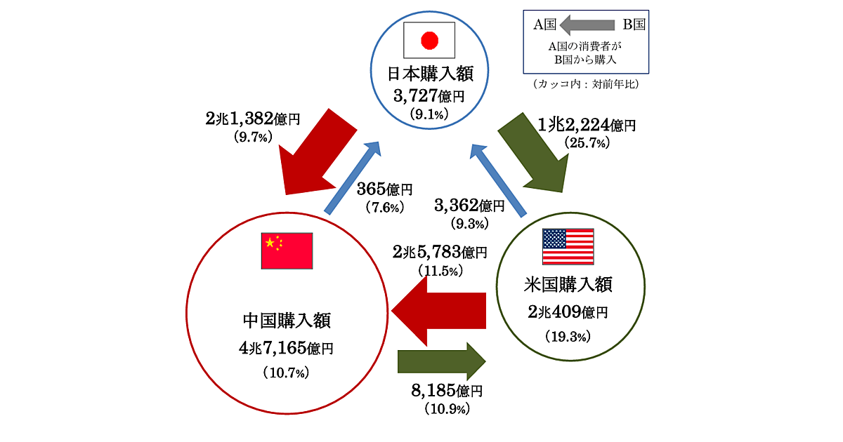 消費国としての中国の越境BtoC-EC(日本・米国からの購入)の総市場規模4兆7165億円で同10.7%。このうち、日本からの購入額規模は2兆1382億円(同9.7%増)、米国経由は2兆5783億円(同11.5%増)。