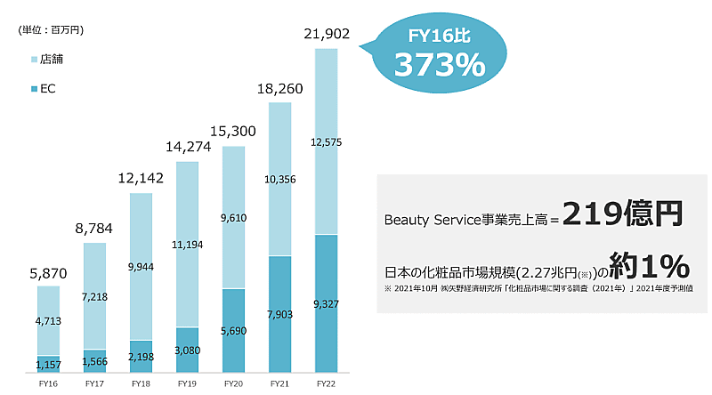 アイスタイルグループが運営する化粧品実店舗「@cosmeSTORE」「@cosme TOYKO」の2022年6月期で126億円の売上規模となっており、今回の事業買収でリアルなユーザー接点を強化する。