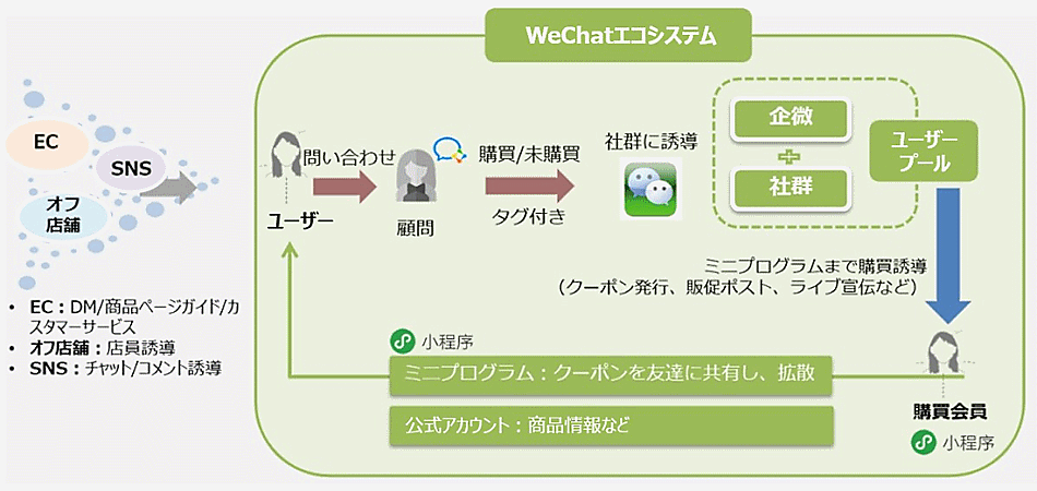 SCRMツールを活用することで、①1on1のチャットまたはグループ内のコミュニケーションを通して、ミニプログラムのリンクまたはクーポンを送付②モーメンツ上での販促情報発信やミニプログラムのQRコードの掲載③消費者の友達へのクーポン共有を促進④ライブによる商品PRを通して消費者の購買意欲を掻き立てる――といった販促活動を行うことができるようになりました。