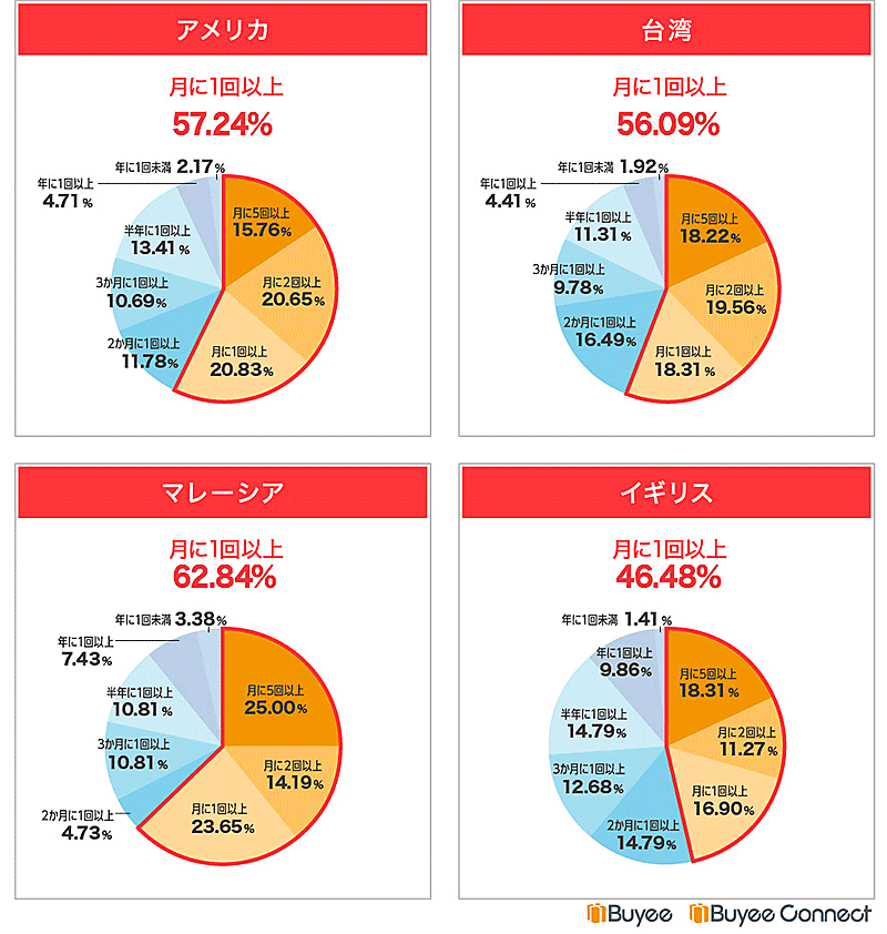 調査対象者に、日本の越境ECを利用する頻度を聞いたところ、全体の約56%が「月に1回以上利用する」と回答した。「月に5回以上」利用する人は全体の約18%で、特にマレーシアが高く25%だった。