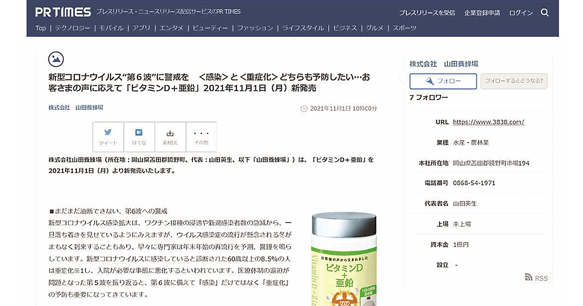 山田養蜂場は「ビタミンD+亜鉛」について2022年11月1日、自社WebサイトとPR TIMESが運営する情報配信サイト「PR TIMES」で、「新型コロナウイルス“第6波”に警戒を<感染>と<重症化>どちらも予防したい顧客の声に応えて『ビタミンD+亜鉛』 2021年11月1日 新発売」というタイトルのプレスリリースを掲載。