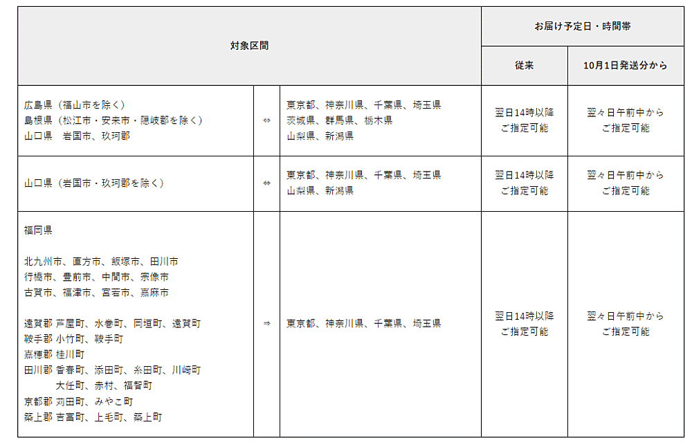 東京都、神奈川県、千葉県、埼玉県、茨城県、群馬県、栃木県、山梨県、新潟県と、広島県(福山市を除く)、島根県(松江市・安来市・隠岐郡を除く)、山口県の岩国市、玖珂郡との区間は現状、発送した翌日の14時以降から時間指定が可能。10月1日からは、発送の翌々日午前中から指定可能に変更する。