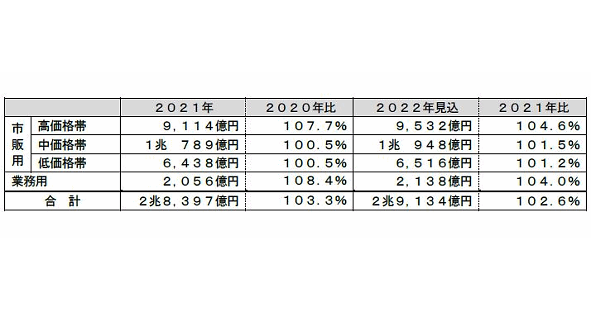 同1.5%増の1兆948億円を見込む。マスクを外す機会が徐々に増えていることでベースメイクの伸びが期待される。このほか、サンスクリーンやヘアケアでは単価アップのため、中価格帯の商品展開など活発な活動が見られることから、市場は拡大する。