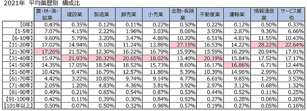 各産業のレンジ別構成比は、半数の5産業で31-40年、3産業で11-20年が最多だった。運輸業は41-50年のレンジが16.8%が最多。100年超は、産業別の構成比で小売業が最多の37.1%で、製造業20.2%、卸売業12.1%、サービス業他12.0%、建設業7.7%と続いた。最も少ないのは情報通信業の0.4%。