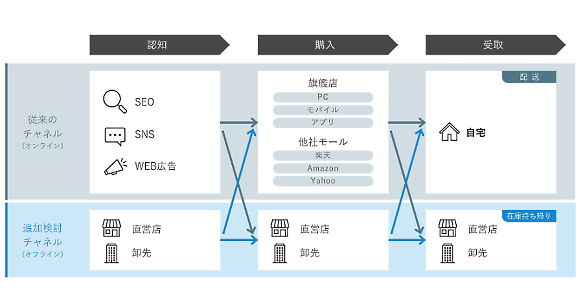 認知・購入・受け取りチャネルに直営店・卸の選択肢を追加することで、一気にチャネルを複線化することで、OMO体制の構築を図っていく。