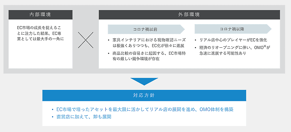 コロナ禍以降、リアル店中心のプレイヤーがECを強化しているほか、経済のリオープニングに伴い、OMOが急速に進展する可能性があると判断。EC市場で培ったアセットを最大限に生かしてリアル店舗の展開を進め、OMO体制を構築する。